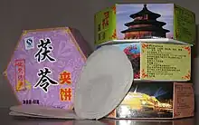 Fuling jiabing (simplified Chinese: 茯苓夹饼; traditional Chinese: 茯苓夾餅; pinyin: Fúlíng jiābǐng), also known Fu Ling Bing or Tuckahoe Pie,[1] is a traditional snack food of Beijing and is an integral part of the city's culture. It is a pancake-like snack made from flour, sugar, and fuling (Poria), rolled around nuts, honey, and other ingredients. The flour can be mixed with fuling (Wolfiporia extensa), a kind of Chinese medicine from Yunnan province that is used to rid the spleen of dampness. Different ingredients are rolled into the pancakes making a variety of Fuling jiabing. The pancakes can be carved into beautiful patterns, too.