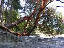Gabriola is about 14 kilometres (9 mi) long by 4.2 kilometres (2.6 mi) wide on average with a land area of 57.6 square kilometres (22.2 sq mi).[23] The topography varies from flat sandy beaches at sea level to forested hills rising to 160 metres (525 ft) on Stoney Ridge in the centre of the island.[24]