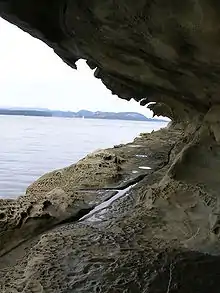 The Southern Gulf Islands consist mainly of former seabed sediments crumpled and gradually thrust upward by tectonic plate movement approximately 55 to 42 million years ago.[21] Subsequent periods of glaciation scraped away topsoil and some of the bedrock. During the peak of the Fraser Glaciation, 30,000 to 11,000 years ago, Gabriola was covered with ice up to 2 kilometres (1.2 mi) thick.[22] Though melting glaciers left deposits of sand, gravel, and boulders, the main rocks exposed on Gabriola's surface are sandstone and shale. Differential erosion of relatively soft shales and relatively hard sandstones helped create cliffs, points, and bays along Gabriola's shoreline.[22]