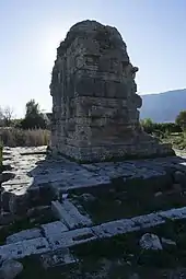 Many honors were heaped upon Gaius by citizens and city officials of the Empire, including Colonia Obsequens Iulia Pisana (Pisa), where it was decreed that proper rites must be observed by matrons to lament his passing. Temples, public baths, and shops shut their doors as women wept inconsolably. To commemorate his brief life, a cenotaph was erected on the Limyrus River at Limyra in Lycia.[62] Posthumously, the Senate voted honours for the young Caesars, and arranged for the golden spears and shields the boys had received on achieving the age of military service to be hung in the Senate House.[62] The caskets containing their ashes were stored in the Mausoleum of Augustus alongside those of their father Agrippa and other members of the imperial family.[62]