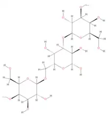 Galactogen is a polymer of galactose with species-specific structural variations. In this polysaccharide, the D-galactose are predominantly β (1→3) and β (1→6) linked; however some species also have β (1→2) and β (1→4).[3] The galactogen of the aquatic Basommatophora (e.g. Lymnaea, Biomphalaria) is highly branched with only 5-8 % of the sugar residues in linear sections, and β(1→3) and β(1→6) bonds alternate more-or-Iess regularly. In the terrestrial Stylommatophora (e.g. Helix, Arianta, Cepaea, Achatina) up to 20% of the sugar residues are linear β(1→3) bound. The galactogen of Ampullarius sp species has an unusually large proportion of linearly arranged sugars, with 5% β(1→3), 26% β(1→6), and 10% β(1→2).[3] Other analyses in Helix pomatia suggested a dichotomous structure, where each galactopyranose unit bears a branch or side chain.[21][22]