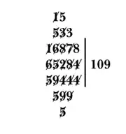 - (omitted) Dividing 5884 by 594 yields 9 which is written as the new digit of the quotient. 58 − 5×9 = 13 so cross out the 5 and 8 and above them write 1 and 3. Cross out the 5 of the divisor. The resulting dividend is now 1384. 138 − 9×9 = 57. Cross out 1,3, and 8 of the dividend and write 5 and 7 above. Cross out the 9 of the divisor. The resulting dividend is 574. 574 − 4×9 = 538. Cross out the 7 and 4 of the dividend and write 3 and 8 above them. Cross out the 4 of the divisor. The resulting dividend is 538. The process is done, the quotient is 109 and the remainder is 538.