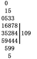 - (b) Compute 6 − 5×1 = 1. Cross out the 6 of the dividend and above it write a 1. Cross out the 5 of the divisor. The resulting dividend is now read off as the topmost un-crossed digits: 15284.
