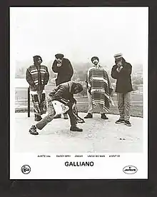 Galliano are a London-based acid jazz group that were originally active between 1988 and 1997. The group was the first signing to Eddie Piller and Gilles Peterson's Acid Jazz record label. The original members were Rob Gallagher (vocals - credited as Roberto Galliano),[1] Constantine Weir (vocals), Michael Snaith (The Vibe Controller) and Crispin Robinson (percussion).