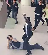 The earliest "Gangnam Style" flash mobs were held in Pasadena, California,[36] and Sydney, Australia.[37] On September 12, Times Square in Manhattan was filled with a flash mob dancing to the music of "Gangnam Style" during ABC's Good Morning America.[38] Five days later, Psy appeared in a flash mob organized by the American entertainment TV show Extra in Los Angeles. The dress code was either "something comfortable" or "Psy-inspired clothing."[39] A "Gangnam Style" flash mob in front of the Obelisco de Buenos Aires national monument in Argentina was shown on the national news programme Antes del Mediodía.[40] In the Indian film Rangrezz, the song is an official parody of "Gangnam Style" featuring Jakky Bhagnani as Psy. All the scenes are from "Gangnam Style" video converted into Mumbai. In Thailand, officials from the Dan Sai municipality in Loei Province shot a video of people wearing masks and performing "Gangnam Style" during the Phi Ta Khon "ghost" festival. According to the Thai newspaper The Nation, villagers and spiritual leaders from Loei province have felt "uneasy" and also "greatly offended" about this "Gangnam Style" performance which tarnishes the image of a 400-year-old tradition.[41]