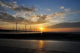 Gaomei Wetlands was established on 29 September 2005.[2] In August 2015, Typhoon Soudelor destroyed 6 out of 18 wind turbines of Taiwan Power Company in the area.[3] In October 2019, a bridge connecting the Taichung mainland with the wetlands area failed a safety inspection, following the Nanfang'ao Bridge collapse 3 weeks earlier in Su'ao Township, Yilan County. The Binhai Bridge (Chinese: 濱海橋) was examined by Taiwan International Ports Corporation. It spans over a length of 70 meters and was 45 years old by the time of inspection.[4]