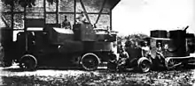 By December 1921 only 26 of these 30 Garfords are accounted for in the records, of these 15 were working and 11 were undergoing repair.[28] Practically all of the armoured vehicles were worn out, especially the chassis. They were particularly affected by the complete lack of spare parts, which could only be purchased overseas. In view of this the decision was taken in 1923 to completely change the chassis of the vehicles to ones suitable for use on train tracks thus turning them into armoured rail cars.[28] This task was carried out at the Bryansk Machine-building Plant, where 21 Garfords were sent (however it is not known whether all of them were refurbished). In 1931 the commission of the Armoured Vehicle Directorate issued an order for the decommissioning of all obsolete types of armoured vehicles including the Garfords. Curiously the order contains information about 27 armoured vehicles of the Garford-Putilov type, this figure does not agree with the data from 1921 or 1923 (26 and 21 vehicles in existence respectively).[22] One way or another during the 1930s all the Garfords were dismantled, usable armour and chassis were transferred for use by the Red Army and unsuitable ones were sent to the Military Funds Bureau. A number of publications suggest the use of Garford-Putilovs by the Red Army during the Second World War, this is only indirectly indicated by a few German photographs showing captured "trophy" Garfords both serviceable and damaged. Although it is impossible to establish the time and place that the photographs were taken, it is reasonable to believe that the photographs depict Garfords captured by the German Army during the First World War.[11]