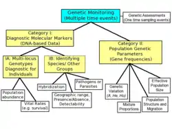 Two broad categories of genetic monitoring have been defined:[2] Category I encompasses the use of genetic markers as identifiers of individuals (Category Ia), populations and species (Category Ib) for traditional population monitoring. Category II represents the use of genetic markers to monitor changes of population genetic parameters, which include estimators of effective population size (Ne), genetic variation, population inter-mixing, structure and migration.