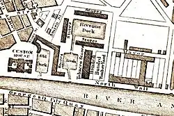 Located near the Custom House,[2] the dock was originally built in 1821 as a working maritime dock and was named for George IV of the United Kingdom.[3] The Inner Dock (previously Revenue Dock), was constructed a few years later in 1824 following the death of John Rennie the Elder and was completed by his son, John Rennie the Younger.[4]