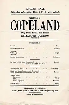 In 1914, the vaudeville impresario Benjamin Franklin Keith offered Copeland a lucrative contract to perform in his Boston vaudeville house. Copeland's initial performance was top-billed, with advertising reading "The Celebrated Pianist GEORGE COPELAND In a Brilliant Program."[35] After several years of performing in vaudeville, Copeland believed that the audiences who went to the vaudeville houses were more open-minded than traditional classical audiences, and that playing in vaudeville was beneficial for classical musicians:[36]