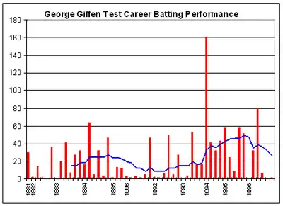 The Australian team touring England in 1886 did not meet with much success, losing all three Tests. Wisden Cricketers' Almanack remarked that "there is nothing to place the [Australians] on any higher standard than would have been attained by any good county team that went playing about the country".[27] Giffen made only 60 runs for in the Tests and took only four wickets.[28][29] In the other matches, however, Giffen was more successful. He made 1424 runs for the tour—only Sammy Jones scored more for the Australians—and took 154 wickets, including five wickets in an innings no less than 13 times.[30][31]