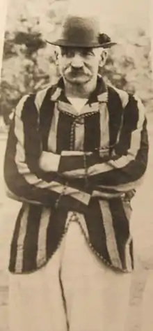 Giffen was selected to tour England with the Australian team in 1882. He was moderately successful, taking 32 wickets at an average of 21.84 and making 699 runs averaging 19.02.[9][10] In the celebrated match against England—later designated a Test match—Giffen made 2 runs in the first innings but was dismissed by Ted Peate for a "duck" in the second.[11] Australia, through a magnificent bowling effort from Fred Spofforth and Harry Boyle, won the match by seven runs. The match was the origin of the term "The Ashes" for Test series between the two nations. A mock obituary placed in The Sporting Times lamented "the death of English cricket" and noted that "The body will be cremated and the ashes taken to Australia."[12]