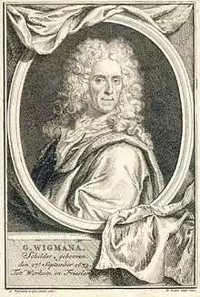 In 1697 he painted a curious group portrait of a family dinner, with the title Mayor Saco van Aitzema of Dokkum and his wife offer Tsar Peter the Great a meal in Amsterdam.[1] He travelled to Rome after that, because according to Houbraken, Wigmana met with the painter Daniel Seiter in Rome in 1699.[2] Houbraken mentioned him again in his biographical sketch of Pieter van Mierevelt, because Wigmana owned one of his paintings. Houbraken intended to write a biographical sketch of Wigmana in his birth year of 1673, but never got that far (he died before publication of Volume III, which ended with birth year 1659). According to the RKD he was a pupil of Jelle Sibrands and travelled to Rome where he received the nickname Friese Raphael.[3] According to Johan van Gool, who called him a narcissus in his biographical sketch of him, Wigmana was in Rome in 1700, but Van Gool did not believe that he got his nickname from joining the Bentvueghels, but rather that Wigmana received his nickname of the Frisian Raphael because he made so many copies of the works of Raphael.[4] Wigmana wrote a book about the art of painting that was published after his death in 1742, and which contained his autobiography with an engraving by Bernard Picart after a self-portrait.