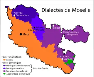 The Germanic-Romance (German-French) language boundary in Lorraine roughly followed the line from Sarrebourg (Saarburg) to Hayange (Hayingen) until well into the 20th century. A detailed map of the boundary is given in the article on the Lorraine Franconian dialect. The Lorraine region northeast of this linguistic boundary in the present-day départements of Moselle and Bas-Rhin (the Alsace bossue) and in the present-day federal state of Saarland was called German Lorraine (Deutsch-Lothringen). Nancy, the historic capital of Lorraine, and Metz, the present capital of the region of Lorraine, both lie on the French side of the boundary. There are clues to the historic boundary in the names of settlements like Audun-le-Tiche (Deutsch-Oth or German Audun) and Audun-le-Roman (Welsch-Oth or Romance Audun) or the names of the two headstreams of the Nied, the Nied Allemande (Deutsche Nied or German Nied) and the Nied Française (Französische Nied or French Nied), which lie on either side of the language boundary and merge almost exactly on the line itself.