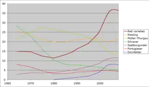 As a wine country, Germany has a mixed reputation internationally, with some consumers on the export markets associating Germany with the world's most elegant and aromatically pure white wines while other see the country mainly as the source of cheap, mass-market semi-sweet wines such as Liebfraumilch.[2] Among enthusiasts, Germany's reputation is primarily based on wines made from the Riesling grape variety, which at its best is used for aromatic, fruity and elegant white wines that range from very crisp and dry to well-balanced, sweet and of enormous aromatic concentration. While primarily a white wine country, red wine production surged in the 1990s and early 2000s, primarily fuelled by domestic demand, and the proportion of the German vineyards devoted to the cultivation of dark-skinned grape varieties has now stabilized at slightly more than a third of the total surface. For the red wines, Spätburgunder, the domestic name for Pinot noir, is in the lead.