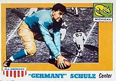 Adolph George "Germany" Schulz (April 19, 1883 – April 14, 1951) was an All-American American football center for the University of Michigan Wolverines from 1904 to 1905 and from 1907 to 1908. While playing at Michigan, Schulz is credited with having invented the spiral snap and with developing the practice of standing behind the defensive line. As the first lineman to play in back of the line on defense, he is credited as football's first linebacker.