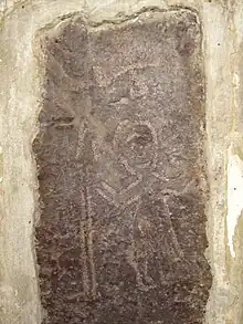 The second slab measures 193 × 117 cm. It depicts a man wearing a long robe decorated below the waist with an ornament; in his right hand he holds a spear, whose spearhead has been destroyed by a Maltese cross. The left hand arches over the hip, which corresponds to miniature figures from the Slavic period.[38]