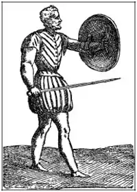 When used in conjunction with another weapon, the shield, of various shapes and sizes, each requiring their own specific uses, was held in the left hand and the weapon in the right hand. This usually necessitated that weapons of the short variety be used since medium and long ones would be too heavy for the right hand alone to wield. The right foot was placed forward and the left foot behind, which although more straining a position than the other way around, kept the right hand in a better place for thrusting, and the left, unarmed side, farther away from the opponent. The shield was held outstretched towards the opponent's face to limit his vision and to parry his weapon closer to its pivot point where it is weakest in its movement.