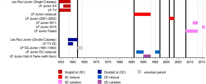 The Les Paul Junior was originally introduced in 1954 as a single-cutaway model, with its double-cutaway counterpart arriving to the market in early 1958.[6] Color schemes most commonly placed on Juniors were vintage sunburst, cherry red, and TV yellow. In 2012, two rare black models with tortoiseshell pickguard, from 1959 and 1960, were described in Vintage Guitar; the possibility was offered that black models were special-ordered for a specific store, or that the black finish was used to cover up blemishes in the wood.[7] In 1961, the body style of the Junior was shifted, and after conflict between Gibson and Les Paul, these models were later renamed the "SG Junior".[8]