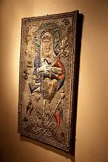 The creation of sacred works is important in Vodou.[200] Votive objects used in Haiti are typically made from industrial materials, including iron, plastic, sequins, china, tinsel, and plaster.[36] An altar, or pè, will often contain images (typically lithographs) of Roman Catholic saints.[283] Since developing in the mid-19th century, chromolithography has also had an impact on Vodou imagery, facilitating the widespread availability of images of the Roman Catholic saints who are equated with the lwa.[284] Various Vodouists have made use of varied available materials in constructing their shrines. Cosentino encountered a shrine in Port-au-Prince where Baron Samedi was represented by a plastic statue of Santa Claus wearing a black sombrero,[285] and in another by a statue of Star Wars-character Darth Vader.[286] In Port-au-Prince, it is common for Vodouists to include human skulls on their altar for the Gede.[208] Many practitioners will also have an altar devoted to their ancestors in their home, to which they direct offerings.[287] In ounfòs where both Rada and Petwo deities are worshipped, their altars are kept separate.[288]