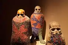 On the saints' days of the Roman Catholic calendar, Vodouists often hold "birthday parties" for the lwa associated with the saint whose day it is.[426] These are marked with special altars for the celebrated lwa,[427] as well as the preparation of their preferred food.[428] Devotions to the Gede are particularly common around the days of the dead, All Saints (1 November) and All Souls (2 November),[429] with celebrations largely taking place in the cemeteries of Port-au-Prince.[430] At this festival, those devoted to the Gede dress in black and purple, with funeral frock coats, black veils, and top hats, all linking to the Gede's associations with death.[431]