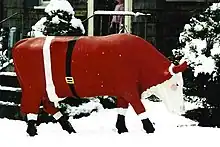 In December 2004, the cow sculpture was converted into a lighted Christmas tree. The use of additional props was expanded to incorporate day-visible ornaments, presents, and a Christmas tree, as well as night-visible multicolored lights.