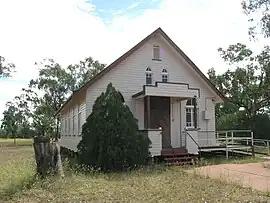 Glenmorgan Community Church is on the north-western corner of Clive Street and Sybil Street (27.2480°S 149.6750°E).[13] It contains a stained glass window as a memorial to Mabel Killen, the founding President of the Glenmorgan Presbyterian Women's Guild.[25] The Meandarra/Glenmorgan Luthern congregation holds their services in the church.[26]
