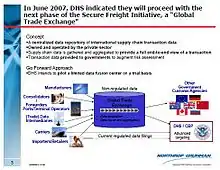 The Global Trade Exchange (GTX) is, or was, a controversial Homeland Security intelligence project,[2] related to maritime-ports data-mining, being one of three pillars of the Safe Ports Act-related Secure Freight Initiatives. The Global Trade Exchange has a mysterious history dating from conception in 2004, a 2007-2008 year of hype, and sudden placement on "hold" status. Described as a ready-to-buy, commercially available database,[3] the GTX was rush-funded by Congress as part of and championed relentlessly by then-United States Secretary of Homeland Security Michael Chertoff in evident disregard of objections of confused and frustrated U.S. private sector trade groups. The Global Trade Exchange was discussed in October 2007 in the House Homeland Security Meeting on Maritime Terrorism and the "Safe Ports Act". In this meeting Customs Commissioner Thomas Winkowski claimed that "our lawyers are trying to get our arms around it".[4].