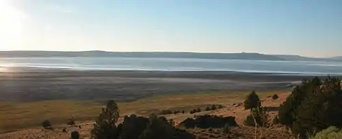 Goose Lake is a large alkaline lake in the Goose Lake Valley on the OregonCalifornia border in the United States. Like many other lakes in the Great Basin, it is a pluvial lake that formed from precipitation and melting glaciers during the Pleistocene epoch.[4][5] The north portion of the lake is in Lake County, Oregon, and the south portion is in Modoc County, California. The mountains at the north end of the lake are part of the Fremont National Forest, and the south end of the lake is adjacent to Modoc National Forest lands. Most of the valley property around the lake is privately owned agricultural land, though Goose Lake State Recreation Area is on the Oregon side of the lake.