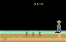 Gopher is an Atari 2600 game written by Sylvia Day and published by U.S. Games in 1982.[1] The player controls a shovel-wielding farmer who protects a crop of three carrots from a gopher.