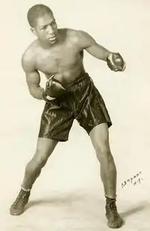 He lost to Jewish boxer and reigning world welterweight champion Jackie Fields on October 21, 1929, in San Francisco before a crowd of 10,000. In an action-filled ten rounds, Jones took the early lead and rocked Fields several times with straight rights to the jaw, but Fields's stamina and aggressiveness wore Jones down in the closing rounds. Fields clearly took the ninth and tenth, and had a clear edge in five rounds, but could not defend against repeated rights from Jones throughout the bout.[3][4] In a match two months later on December 13, referee Joe O'Connor stopped the bout, complaining that Jones was not giving his "usual exhibition" and ordered the promoter to pay the purses for both fighters. The Boston Globe felt the fight was legitimate, however, and that Jones's long arms against Fields's desire to fight at close range made the boxers look as though they were trying to avoid coming to blows.[5]