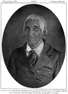 Tah-won-ne-ahs or Thaonawyuthe (born between 1737 and 1760, died December 26, 1859), known in English as either Chainbreaker to his own people or Governor Blacksnake to the European settlers, was a Seneca war chief and sachem. Along with other Iroquois war chiefs (most notably Mohawk leader Joseph Brant), he led warriors to fight on the side of the British during the American Revolutionary War from 1777 to 1783. He was prominent for his role at the Battle of Oriskany, in which the Loyalist and allied forces ambushed a force of Patriots.[1] After the war, he supported his maternal uncle, Handsome Lake, as a prominent religious leader. Chainbreaker allied with the United States in the War of 1812 and later encouraged some accommodation to European-American settlers, allowing missionaries and teachers on the Seneca reservation.