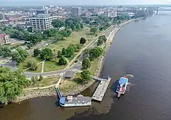When it was first created in the late 19th century, the park was named Spence Park after Thomas H. Spence, who had given the land to the city.[3] The waterfront west of Spence Park had been used by a ferry, but when it closed in 1891, that area became part of the park as well after it was expanded and filled using sediment collected from dredging the main channel.[4][5] In 1908 Mayor Wendell Anderson invited landscape architect John Nolen to design the city's emerging parks system.[6] Nolen's resulting 1911 plan was extensive, though it only drew up an explicit design for what he called “Levee Park.” Construction of the park was carried out according to his plan in 1912. Since then, the park has evolved in a way that no longer strictly resembles Nolen's original design, though the general shape and placement of major features within the park remains truthful to it.[5][7]