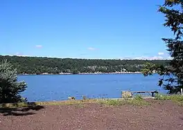 The geology of the Green Pond region is peculiar.[4] The lake is situated in the center of the precambrian New York-New Jersey Highlands, a northeast-southwest system of folded and faulted igneous and metamorphic rocks that form numerous ridges and valleys. The "Green Pond Outlier", named for the lake, is a thin belt of Paleozoic sedimentary rocks that bisects the precambrian crystalline rocks and extends for more than 60 miles (97 km) between Interstate 80 in New Jersey and the New York Thruway in New York. In some places, the ground cover is glacial till from the terminal moraine of the Wisconsin glaciation.