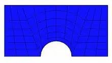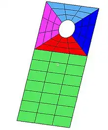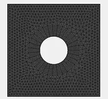 In far more complex geometries it is logical to use large number of blocks and therefore it leads to unstructured grids.[4] These are widely accepted in computational fluid dynamics because this gives us far more flexibility and computer resources are also efficiently utilized. In this case two-dimensional unstructured mesh uses triangle elements while three-dimensional uses tetrahedral elements. These are combination of small structured mesh arranged in unstructured pattern. In this type of grid each single cell is treated as a block. There is no structure of coordinate lines that is given by the grid. The advantage of this type of grids is that mesh can be refined wherever needed. This is based on the fact since the control volume can be of any shape therefore restriction on number of adjacent cell is lifted. This uses various combinations of cell shapes. Hybrid grid can also be used. Hybrid grids are those in which mixture of triangular and quadrilateral elements are used to construct grids. In three dimension combination of tetrahedral and hexahedral elements results in hybrid grid. Example of hybrid grid is shown in Figure 5. Unstructured grids reduces the time which is required for meshing and mapping. Therefore, grid generation is faster and easy. Various automatic techniques especially those associated with Finite Element Method also utilize unstructured grids. Mesh refinement and adaption is easy in unstructured grids.