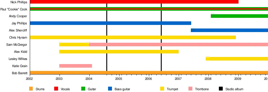 | Members | Bob Barrett Paul "Cookie" Cook Sam McGregor Lesley "Willis" Wilkes Alex Shercliff Andy Cooper |