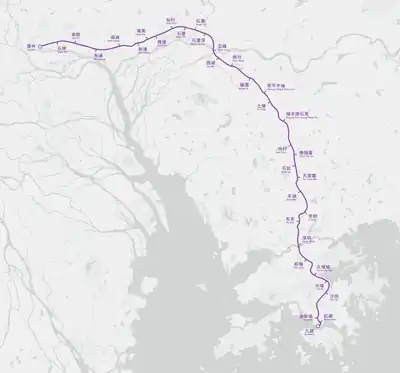 The following shows the stations served by the through train in 1911 upon the commencement of service.[7] Most of them became stops of Guangzhou–Shenzhen railway. The through train service was suspended on 14 October 1949 after communists occupied Canton.
