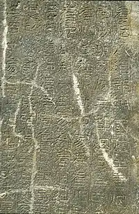 Gwanggaeto's accomplishments are recorded on the Gwanggaeto Stele, erected in 414 at the supposed site of his tomb in Ji'an along the present-day China–North Korea border.[20] Constructed by his son and successor Jangsu, the monument to Gwanggaeto the Great is the largest engraved stele in the world.[21][22]