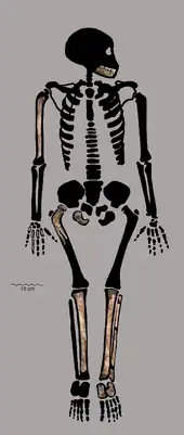 H. naledi was a biped and stood upright.[6] Like other Homo, they had strong insertion for the gluteus muscles, well-defined linea aspera (a ridge running down the back of the femur), thick patellae, long tibiae, and gracile fibulae. These indicate that they were capable of long-distance travel.[25] The H. naledi foot was similar to that of modern humans and other Homo, with adaptations for bipedalism and a humanlike gait. The heel bone has a low orientation, comparable to those of non-human great apes, and the ankle bone has a low declination, which possibly indicate the foot would have been subtly stiffer during the stance phase of walking before the foot pushed off the ground.[27]