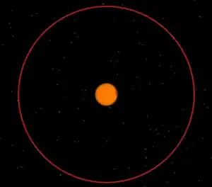 HD 38801 b is an extrasolar, gas giant planet located in the constellation of Orion[3] whose discovery was announced in 2009 and was made using the radial velocity method.[4] The object, with a mass roughly 12 times that of Jupiter,[4] is located 324 light years (99.4 parsecs) from Earth[5][6] orbiting 1.65 astronomical units from its G-type star, HD 38801.[4][7] HD 38801 b, besides being the only planet in its system[5] also lies within the inner habitable zone[6] and takes around 1.9 years, or 693.5 days to complete a full orbit.[4]