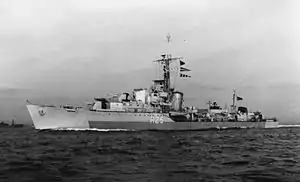 After returning to Britain early in 1946, Carysfort was placed in reserve at Portsmouth, briefly recommissioning in 1947 for a training cruise to the Mediterranean before returning to reserve.[2][5] She was modernised by Yarrows at their Scotstoun shipyard between 23 January 1954 and 14 December 1956, and then re-entered service as part of the 6th Destroyer Squadron.[2] Carysfort served two commissions with the 6th Squadron, with the flotilla alternating between home waters and the Mediterranean.[2][6] From 1956 to 1958 R J Trowbridge captained her in the Mediterranean.[7] In 1959 Carysfort was part of the Home Fleet and took part in 'Navy Days' in Portsmouth during that year.[8] In September 1959, Carysfort transferred to the 8th Destroyer Squadron as a replacement for Cheviot, arriving at the Squadron's base at Singapore in November that year.[2][9] She subsequently served in the Far East during the Indonesian Confrontation.