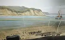 On 23 January 1781, while trying to intercept French ships attempting to run the blockade at Newport, Rhode Island, Culloden encountered severe weather and ran aground at North Neck Point (Will's Point) in Montauk.[4] All attempts to refloat the vessel were unsuccessful, but all the crew were saved, and Culloden's masts were taken aboard HMS Bedford.[5] The area is today known as Culloden Point.