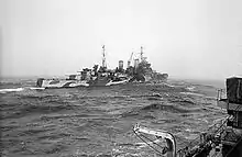 Trinidad as seen from HMS Fury in the North Atlantic during an Arctic convoy escort patrol. Trinidad is dazzle-painted.