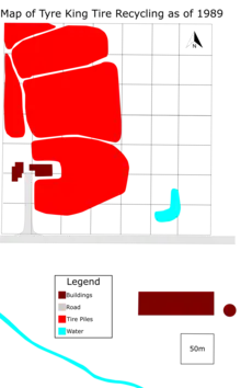 The facility was owned and operated by Ed Straza, who intended to recycle the tires but was unable to find a market for them. According to Guy Crittenden, Straza spent two years resisting orders from the Province of Ontario to mitigate the risk of fire on the basis of financial hardship.[8][9] On 6 April 1989, the Ontario Environmental Appeal Board issued a judgment declaring that the practices of Tyre King Tyre Recycling, Ltd. "represent a major environmental hazard". While the judgment stated that the risk of fire was low, a fire would have profound ecological consequences. Because of this, the facility was barred from collecting additional tires after 1989 and required to organize tires into 10 foot piles with adequate fire lanes between piles.[10] Another ruling from the Environmental Appeal Board, that the perimeter of the facility be fenced, was not carried out when the facility caught fire, and the nearest source of water to the facility was a pond approximately 250 meters away.[6]