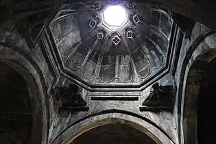 The largest church in the complex, the Cathedral of Surb Nshan, probably begun in 976, was completed in 991 by king Smbat. It is a typical example of tenth-century Armenian architecture, its central dome rests on the four imposing pillars of the lateral walls. The outside walls are dotted with triangular recesses. A fresco in the apse depicts Christ Pantocrator. Its donor, the Armenian Prince Khutulukhaga, is depicted in the south transept (a transversal nave intersecting the main nave). The sons of the church's founder, Princes Smbat and Kurike, are shown with Queen Khosravanuysh in a bas-relief on the east gable. Apart from one or two minor restorations carried out in the eleventh and twelfth centuries, the church has retained its original character.