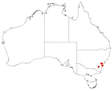 Hakea dohertyi is found in a highly restricted area within Kanangra-Boyd National Park, most plants grow near the Kowmung River.The total area of its range is 18 km2 (6.9 sq mi). It grows on sandy or rocky soils over shale or quartzite, and is found on ridges in open sclerophyll forest with grey gum (Eucalyptus punctata, silvertop ash (E. sieberi), Blaxland's stringybark (E. blaxlandii), forest she-oak (Allocasuarina torulosa), and shrubs such as crinkle bush (Lomatia silaifolia), (Stypandra glauca), and narrow-leaved geebung (Persoonia linearis).[7] Hakea dohertyi is killed by bushfire and regenerates from seed stored in a seed bank in its canopy. Most seed is released from the woody follicles after bushfires, but some follicles open and release seed at other times.[7] As the plant requires five years to mature and set seed, bushfires occurring more frequently than this could wipe out the species entirely. The species is currently classified as endangered. It is grazed upon and threatened by wild goats. The rising of the water level of Lake Burragorang could also threaten populations.[1][4][7][8]