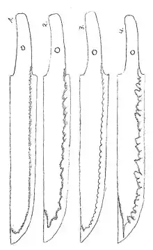 Conversely, irregular hamons do not simply follow the edge, but deviate from it considerably in various ways. The two main groups are "undulating" or "wavy" (notare) and tooth-like or "zig-zag" (gunome), and these are often classified by the wavelength or breadth of the irregularities. Sometimes hamons can consist of one style, a mixture of two, or all three (e.g. gunome midare, notare midare, toran midare, etc.), with many other differences sometimes added in for effect. Kataochi gunome resembled saw teeth, whereas uma-no-ha gunome resembled horse teeth. Fukushiki gunome consists of multiple sizes and shapes of teeth mixed with areas of regularly sized and shaped teeth. Koshi-no-hiraita midare consists of waves with wide valleys and steep crests, and were mainly found on Bizen swords of the Muromachi period.
