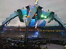 Genesis and Paul Young performed in the first concert at Hampden, in 1987.[150] The Rolling Stones played there in 1990, during their Urban Jungle Tour.[150] Since the redevelopment of Hampden was completed in 1999, many acts have performed there, including The Rolling Stones, Tina Turner, Rod Stewart, Bon Jovi, Eagles, U2,[151] Oasis, George Michael, the Red Hot Chili Peppers, Neil Diamond, Take That, AC/DC, Bruce Springsteen, Coldplay, Pink, Paul McCartney, Rihanna,[152] The Stone Roses,[153] and Beyoncé. The damage caused to the Hampden pitch by a U2 concert in August 2009 forced a Queen's Park league match to be postponed.[151]
