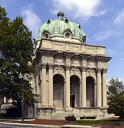 Judge John Handley (1835–1895), an Irish-American coal magnate and lawyer from Scranton, Pennsylvania, visited Winchester several times and admired the city for its Scotch-Irish heritage. In his will, he left $250,000 for the city to erect a library "for the free use of the people of the city of Winchester" and schools for the poor. Construction of the library, designed by New York architects Barney and Chapman, was not begun until 1908.[3][4] The cornerstone ceremony on May 26 was preceded by a large parade.[5] The building's fireproof construction and facilities were considered advanced at the time of completion.[4] The total cost of construction and furnishings was $233,230. The library opened on August 21, 1913, and originally featured a 300-seat lecture hall, study rooms and conference areas. C. Vernon Eddy was Handley's first librarian, serving in that position until 1960. Originally only white patrons were allowed to visit the library; in December 1953 city officials began allowing all residents to use the facility, regardless of race.[5]