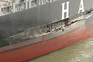 Hanjin Venezia, formerly named the Cosco Busan, is a 275 m (902 ft) container ship. On 7 November 2007, it collided with the protective fender of the Delta Tower of the San Francisco–Oakland Bay Bridge in heavy fog.[3] The collision sliced open two of its fuel tanks and led to the Cosco Busan oil spill in San Francisco Bay.[4] She was renamed the Hanjin Venezia after the accident.[5]